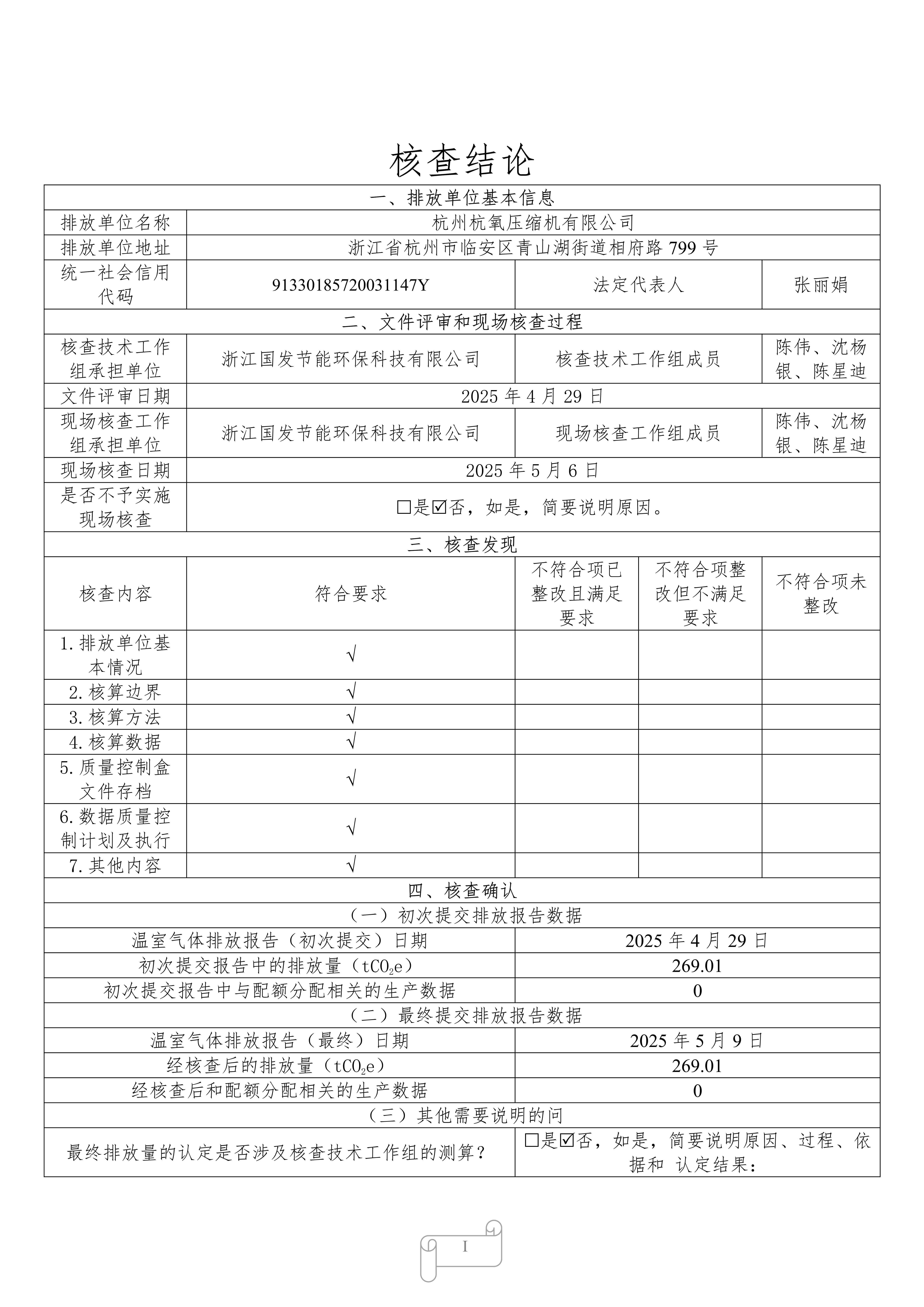 杭州杭氧壓縮機(jī)有限公司2024年度溫室氣體排放核查報(bào)告